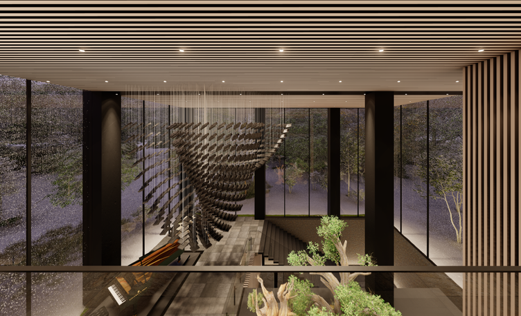 その空間の具体例として,ホテルのエントランスロビーを想定し,日本の伝統や格式と進取の気性を合わせ持った「おもてなしのこころ」を瓦によって体現した.